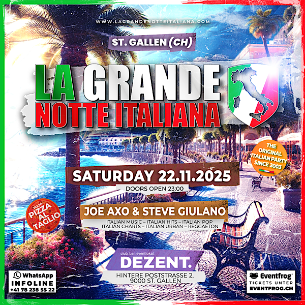 Dezent Hintere Poststrasse 2,St. GallenLA GRANDE NOTTE ITALIANA BIG OPENING DEZENT ST. GALLEN - Ciao San Gallo - Samstag, 22. November 2025 @ Dezent Club St. Gallen >>> Ticket <<< Signore e Signori, Italien – ein Land… Weiterlesen »La Grande Notte Italiana – Dezent St. Gallen